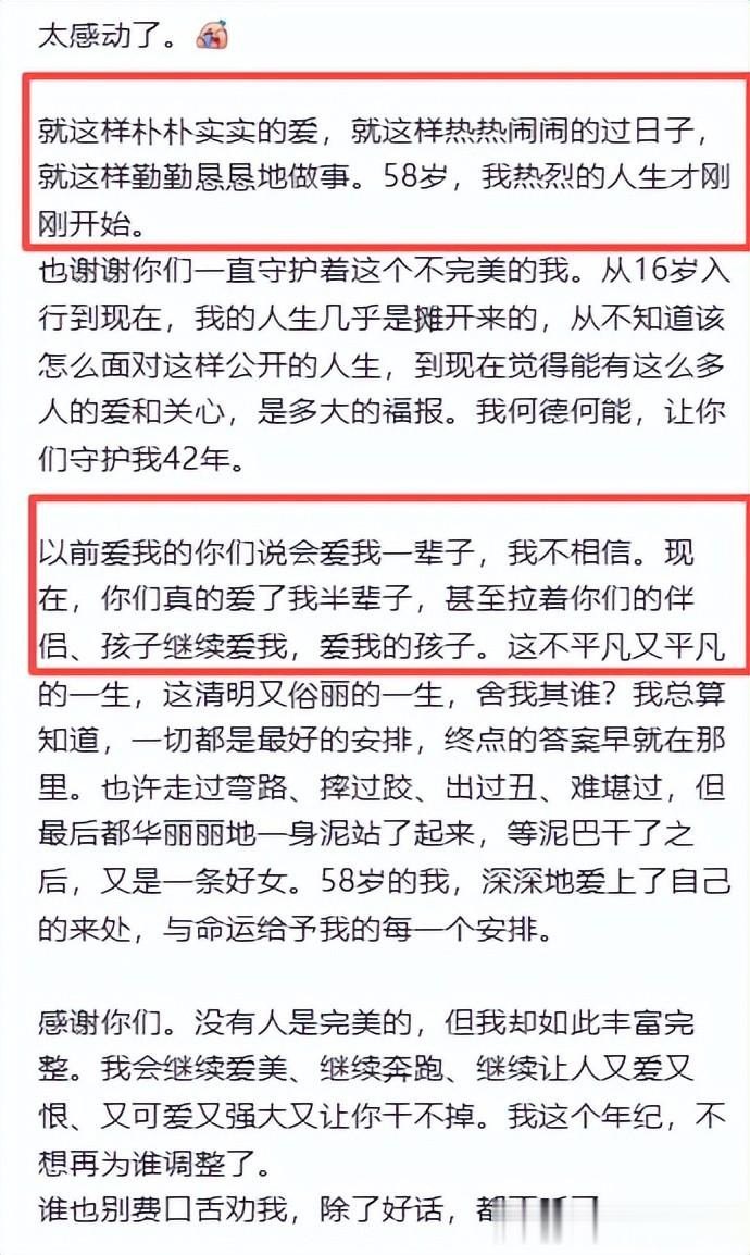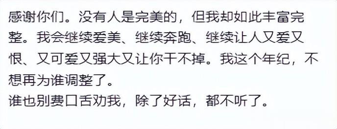 而伊能静能保握这般好气象,除了日常的珍惜,更多的是心态的随便,正如她在长文里写的:“58 岁,我决定不为任何东谈主调度我方了,你别再劝我,我只听好话。”