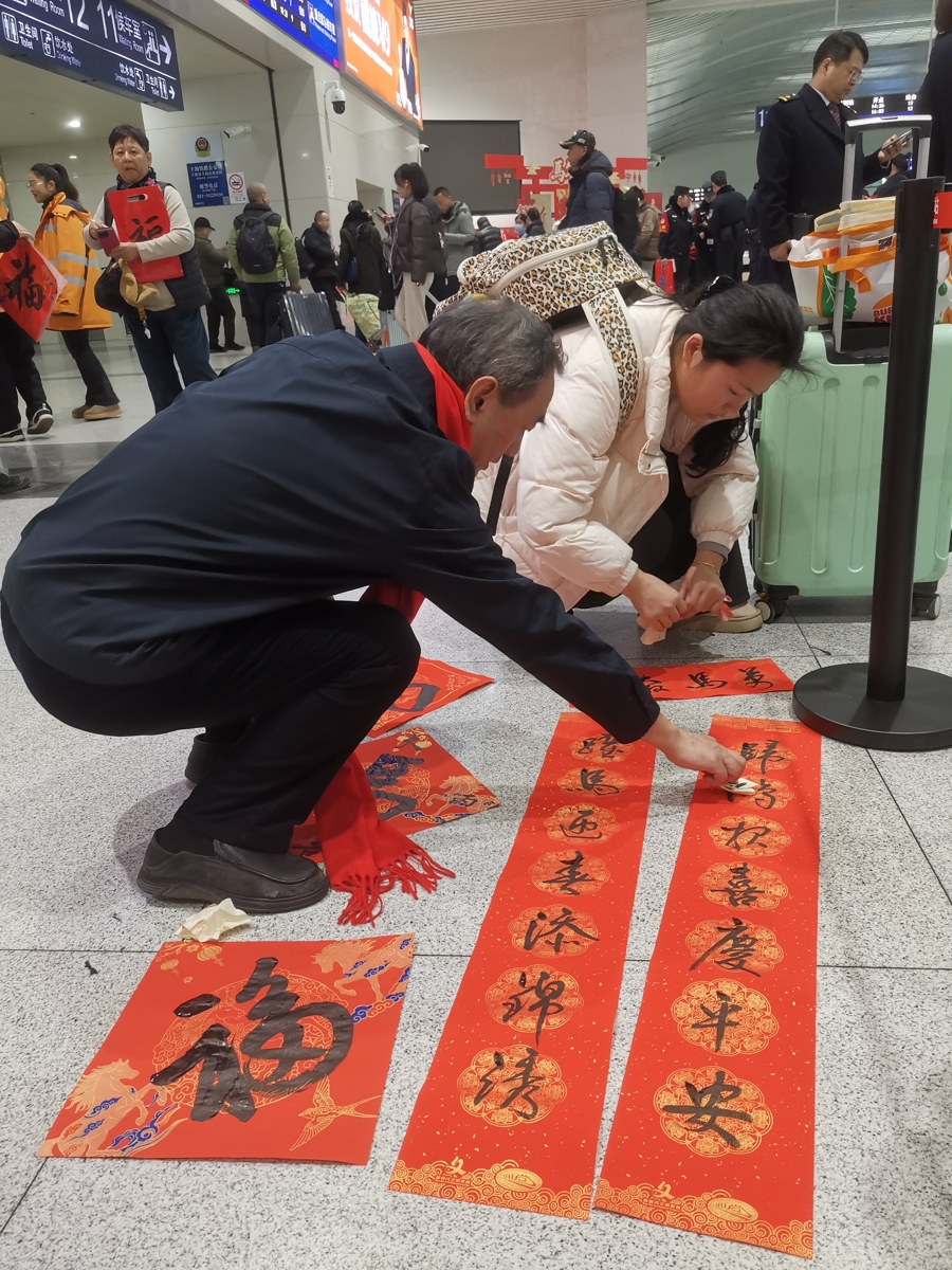 上昼9时,上海站北进厅,铁路部门正在开展送春联、福字行径,书道家们摆开“表象”,羊毫蘸满墨汁,现场写福字和春联,送给行将踏上路径的游客们。