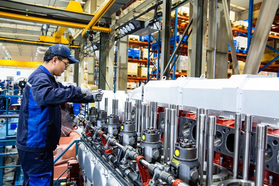 在中动瓦锡兰发动机(上海)有限公司的装试车间,工程师们正对一台大缸径双燃料中速发电机组进行终末调试。这台用于LNG运载船的“腹黑”,春节前就要完成最终委用。“当下航运业绿色转型提速,寰球船舶市集需求激增,咱们的发动机出产订单已排至后年,车间正开足马力稳产保供,以硬核产能抢握行业发展新机遇。”公司副总司理于恩程说。