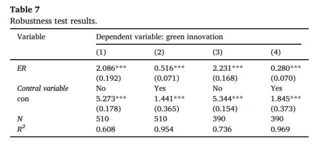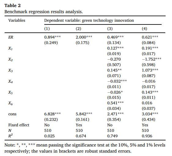 表2展示了环境规制对绿色时候革命影响的基准转头终结。礼聘固定效应模子的揣测终结领路,环境规制(ER)的总共为0.621,在1%水平上权臣为正,标明环境规制强度的提高约略有用促进绿色革命水平。在礼貌变量方面,经济发展水平(X1)、东谈主才界限(X3)和财政收入水平(X5)均与绿色革命权臣正筹划;而工业结构(X2)与绿色革命呈负筹划但不权臣;对外绽放进度(X4)和商场化水平(X6)也未发挥出权臣影响。