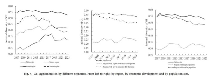 图4从左至右展示了按区域、经济发展水和缓东谈主口界限分袂的绿色革命聚集特征。终结领路,东部、经济发达和东谈主口粘稠地区的革命聚集进度昭彰更高,而西部、经济欠发达和东谈主口较少地区的聚集进度较低。