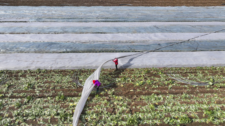 2025年12月11日,在山东省东营市广饶县李鹊镇,农民为作物掩饰防寒无纺布,打法寒潮(无东说念主机像片)。新华社发(刘云杰 摄)