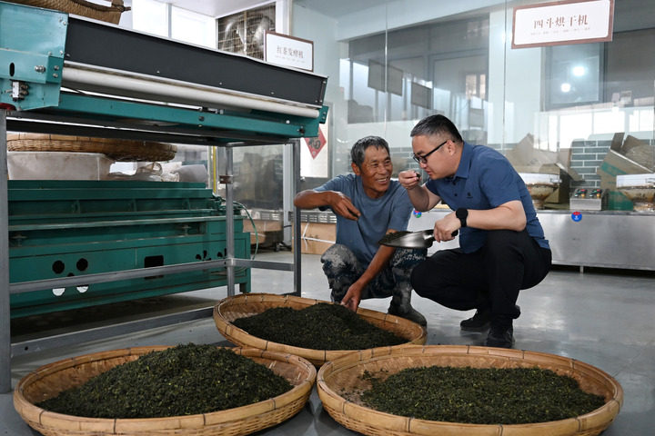 2025年5月25日,在山东省日照市五莲县丁家楼子村,第一文书郑勇山(右)在村里的茶叶合营社调查茶叶品性。新华社记者 马宁 摄