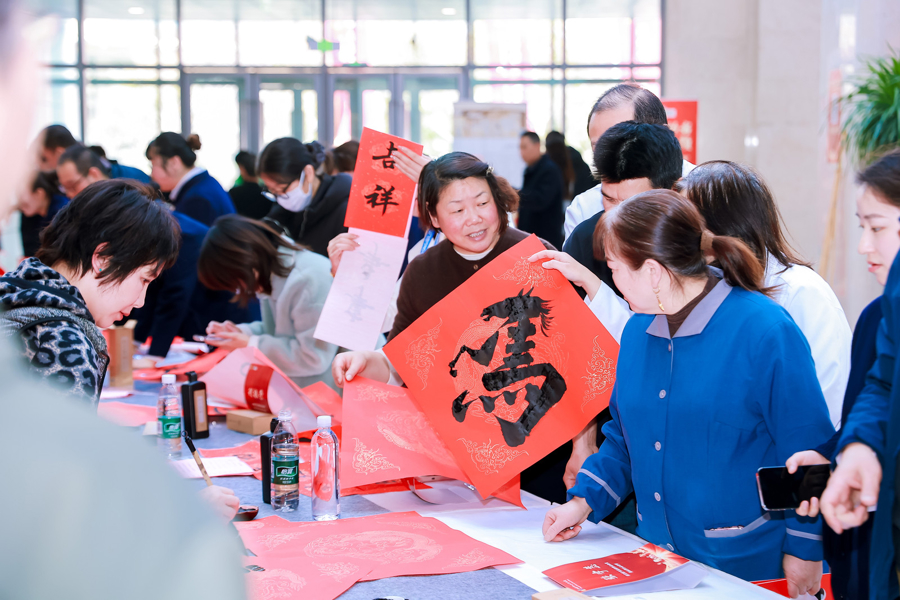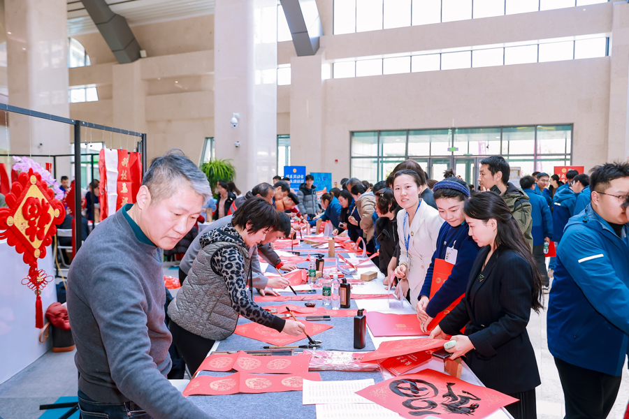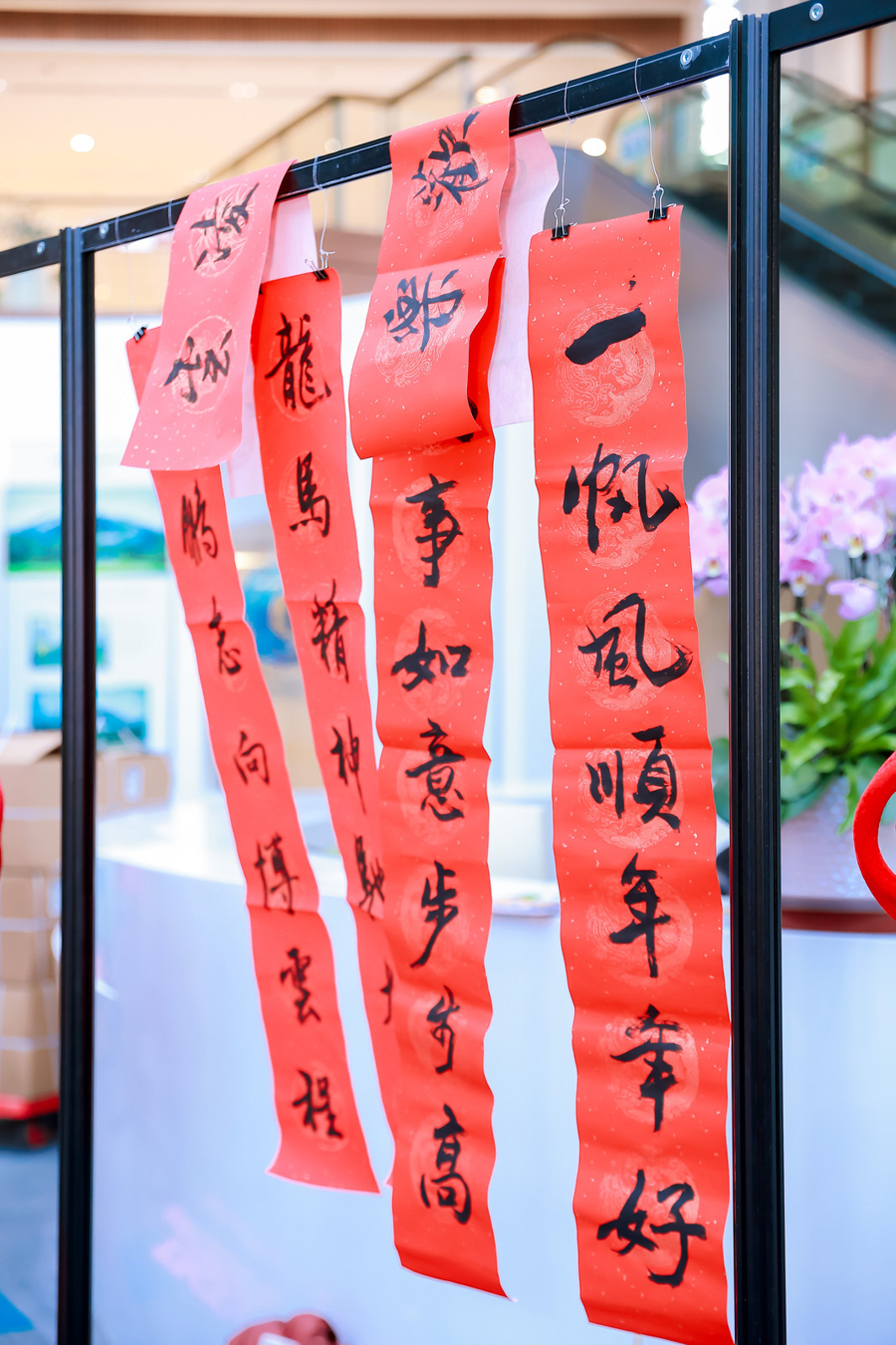 主舞台外围,同时拉开帷幕的“新春游园会”亦然一派欢声笑语,年味完满。在“文字迎春区”,书道家们挥毫泼墨,一幅幅寓意祯祥的对联和“福”字赠予员工,墨香传递道喜。