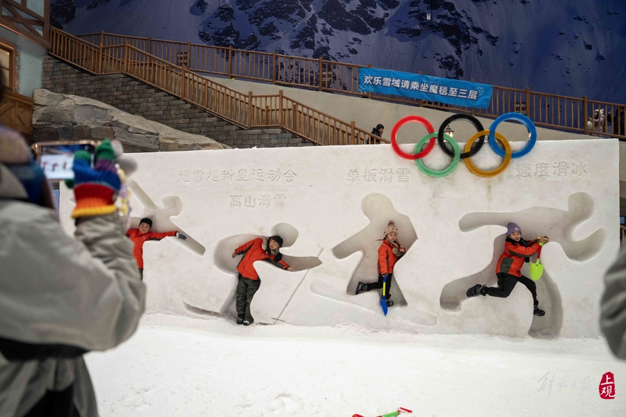 春节左右,上海耀雪冰雪世界化身冰雪瑶池,为市民旅客带来别具一格的年味体验。娱雪区高达数米的八骏图冰雕抬头屹立,金发碧眼的外籍演员跳起传统英歌舞,这场“冰雪+非遗”的创意和会,让南边旅客在银装素裹中感受到浓浓的传统年味。滑雪谈上,冰雪顾惜者尽情疾驰,畅享冰雪之乐。