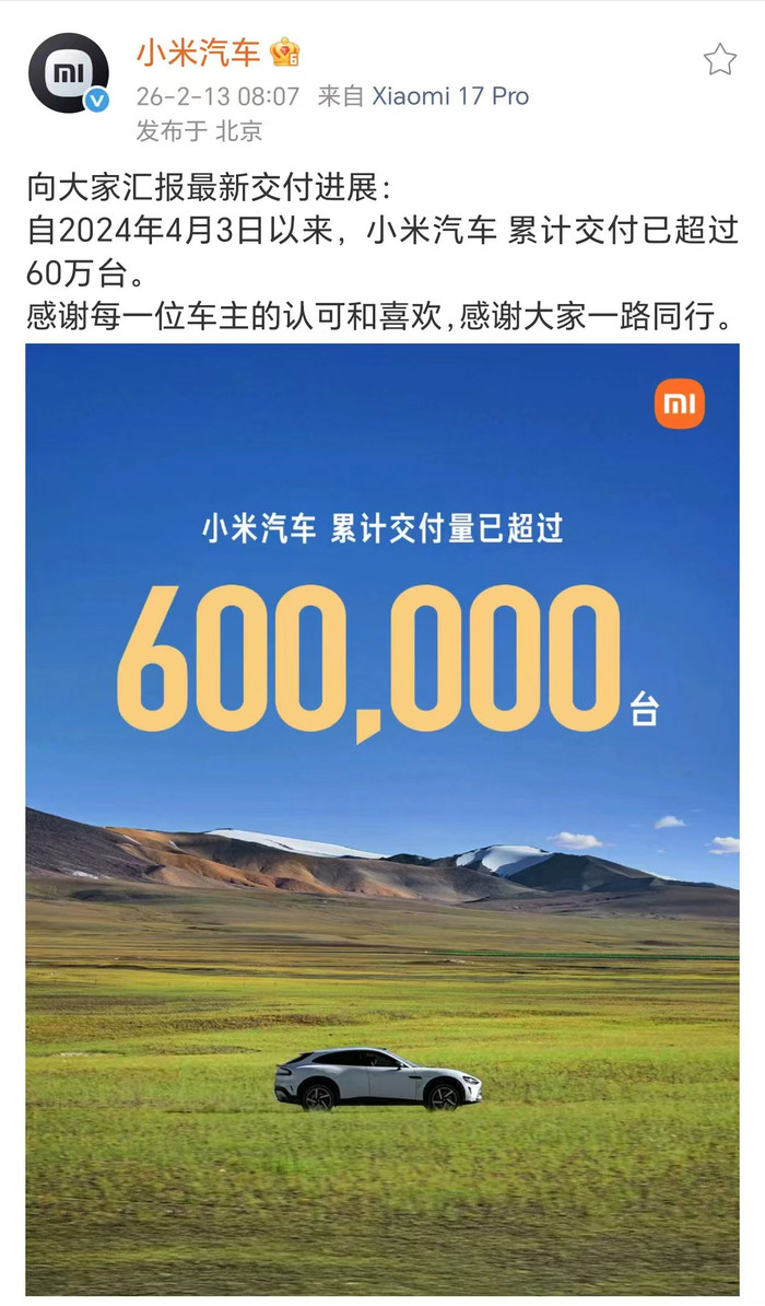 小米汽车的车型包括SU7、YU7以及SU7Ultra。小米创办东说念主、董事长雷军2月11日曾在微博暗示,“跟着临了一辆车下线,第一代SU7自在停产了”。据雷军先容,第一代SU7于2024年4月自在驱动录用,鸿沟到2026年2月,其录用总量跨越38.1万辆。