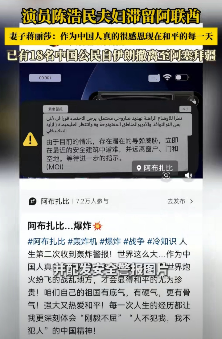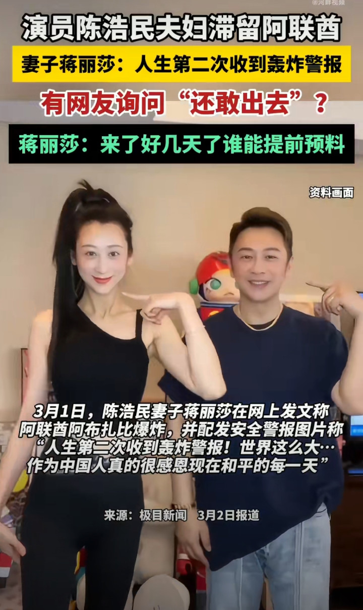 2026年3月3日晚,陈浩民细君蒋丽莎发布视频称,迪拜酒店窗出门现自尽式无东说念主机低空遨游,陪同斗争机轰鸣声和爆炸火光,浓烟赫然可见。