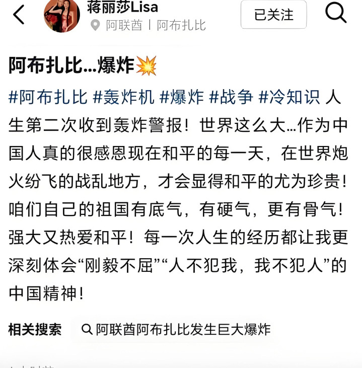 途中蒋丽莎发视频报吉祥:“但愿一切顺利,感德温文”,并阐发计较地为迪拜机场。