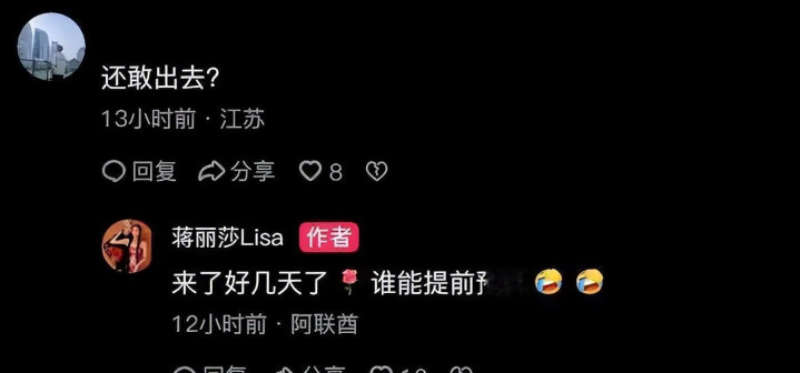 面临网友还敢出去的质疑,蒋丽莎诠释:“来了好几天,谁能预”。
