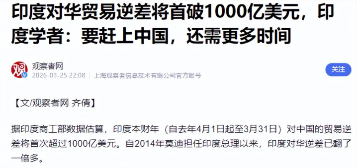 第二层是对内,缓解贸易不屈衡带来的政事压力,2025财年中印外贸顺差将初度率性1000亿好意思元,这类数字在印度国内很容易被简化成一句话,“咱们买太多中国货”。