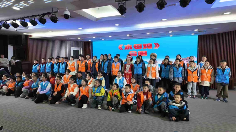 孩子们还齐唱了两遍《水母鸡》,一遍壮语、一遍汉语:水母鸡,游呀游,你莫飞上天,莫要去很远,就在咱壮乡,游在田庐边。