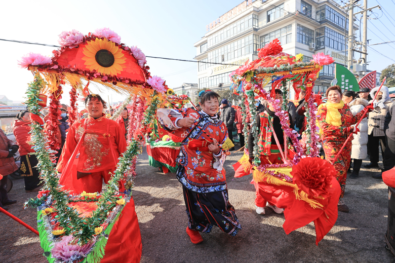 2月2日,在江苏省连云港市赣榆区墩尚镇,东谈主们进行民风“踩街”饰演。 新华社发(司伟摄)