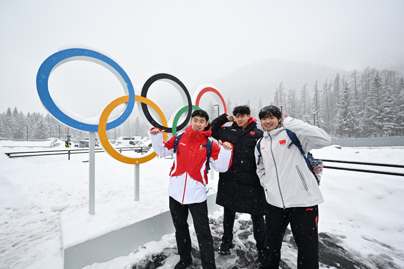 2月3日,在科尔蒂纳丹佩佐奥运村,中国雪车队洞开员孙楷智、石曜隆、丁运达(从左至右)与奥运五环合影。 新华社记者 连漪 摄