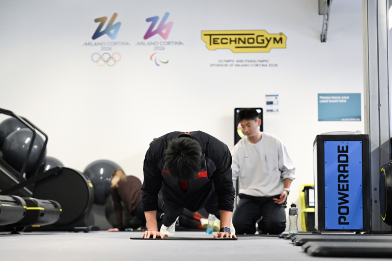 2月3日,在科尔蒂纳丹佩佐奥运村,中国雪车队洞开员李纯键(前)在配套健身房内行径。 新华社记者 连漪 摄