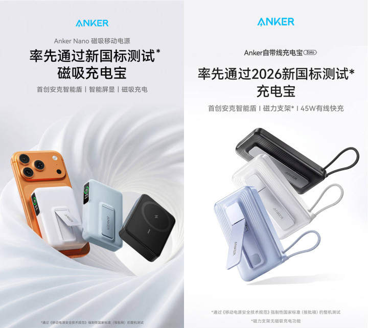 面临新国标出台与当下浮滥者对合规充电宝的伏击需求,安克领先推出了两款通过新国标整机测试的充电宝家具——安克磁吸充电宝(型号:A110Z)与安克自带线充电宝(型号:A1116),实时为浮滥者提供妥当表率的遴荐。