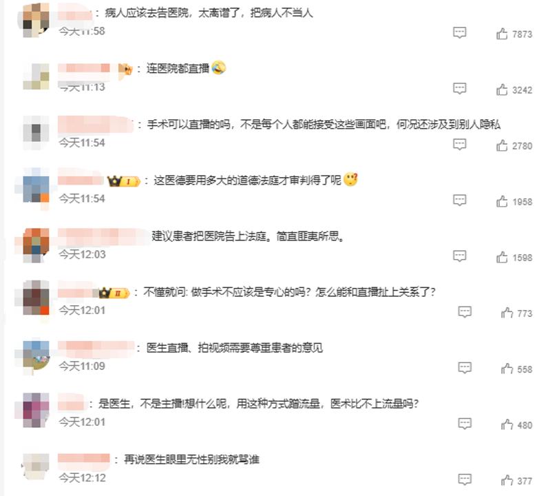 部分网友示意:“任何行业皆有我方的伦理和法例,医疗行业更是,大夫为了流量在视频号上跌破底线,公开传播病东谈主秘密部位手术视频,严重违犯了医学伦理学,更是作歹的,眼睁睁看着直播间东谈主数从一千多到五万东谈主,不良居心的东谈主在评述区秽语污言!”