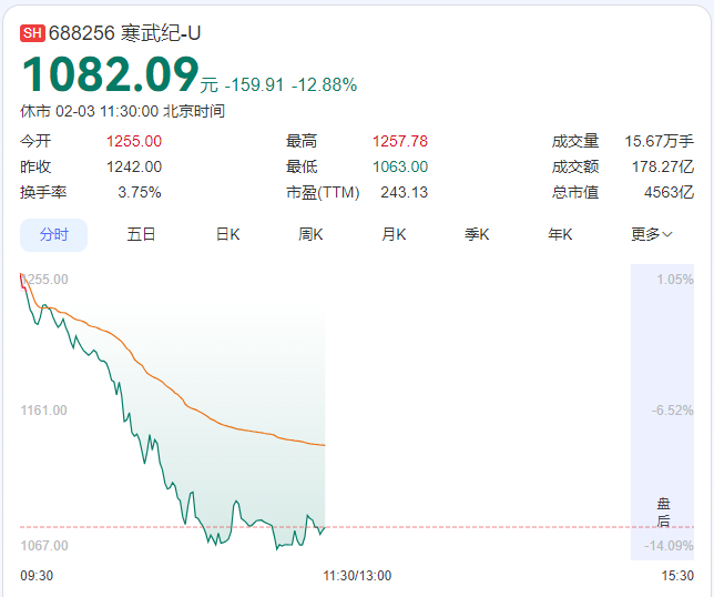2月3日,寒武纪-U(SH688256)盘中大幅跳水,为止中午休市股价跌近13%,总市值回落到4500亿元阁下,挥发超700亿元。